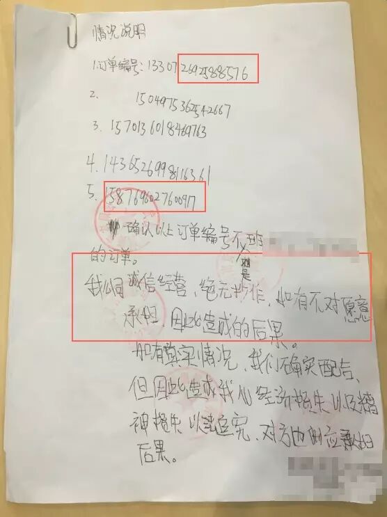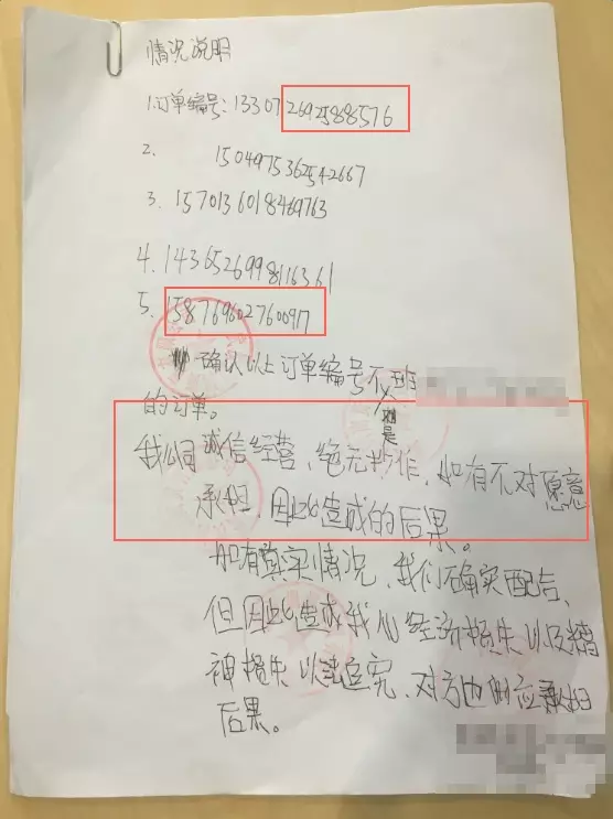 张某给工商写下的“没有刷单”保证书,红圈是被淘宝鉴定的缺位、错误订单号。
